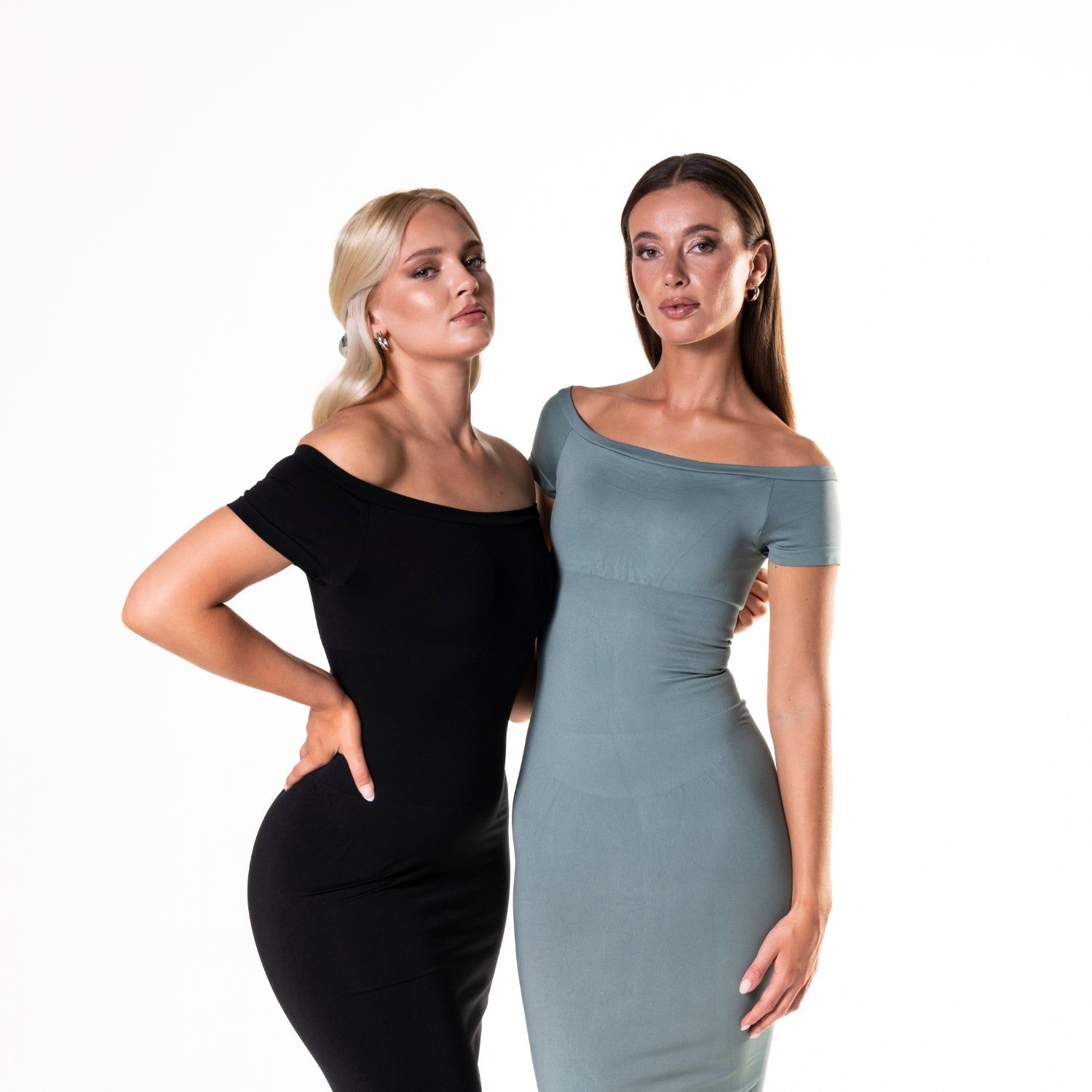 The Off-Shoulder Shapewear Split Midi Dress is a statement piece for party and formal occasions. Designed with a short sleeve, asymmetric neckline and elegant midi length, it beautifully frames the collarbone, shoulders, and neck while offering a sophisticated silhouette.
